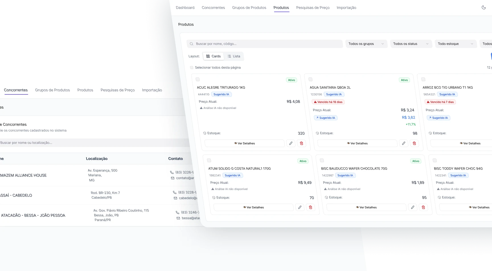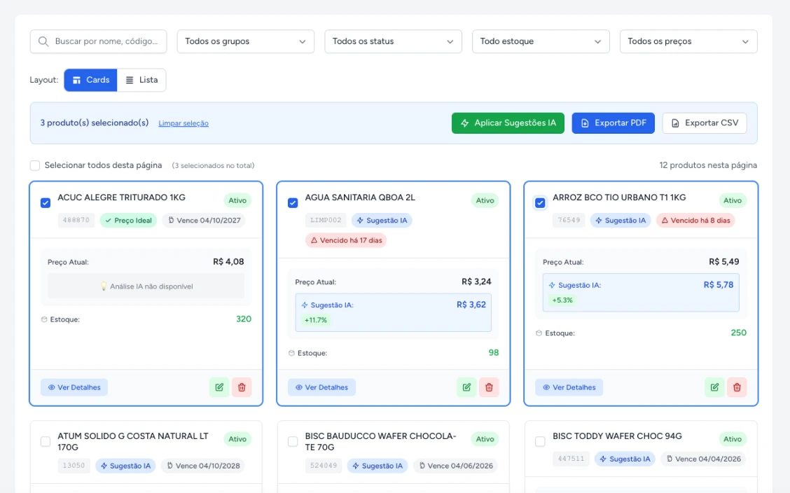 Sim! Integramos por API ou CSV e exportamos as recomendações para aplicação no seu ERP/PDV existente. Não é necessário trocar seus sistemas.